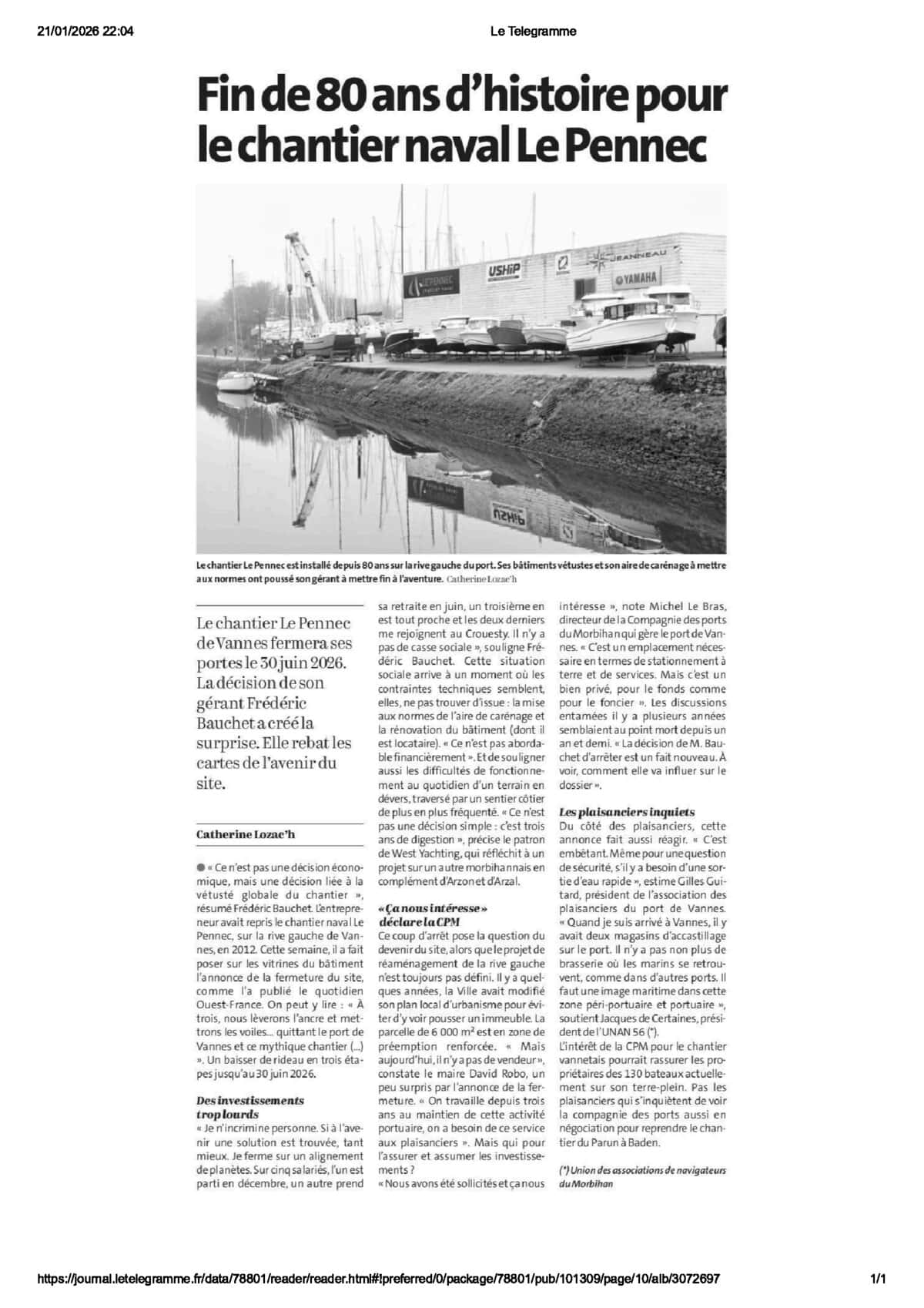 FIN DE 80 ANS D’HISTOIRE POUR LE CHANTIER NAVAL LE PENNEC TELEGRAMME DIMANCHE 18 JANVIER 2026